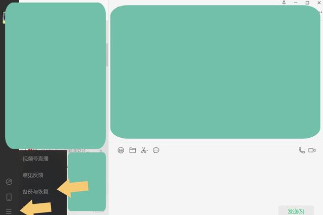 登录电脑版微信以后,点击主界面左下角的“三条横线”,在弹出的界面里找到“备份与恢复”选项。如下图: