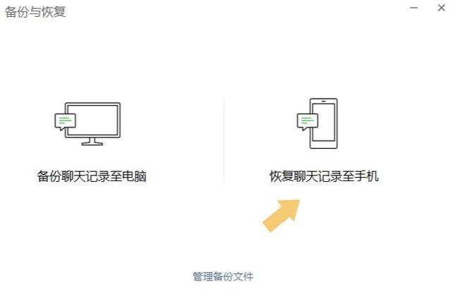 登录之后,再次点击主界面右下角的“三条横线”,选择“备份与恢复”选项,再选择“恢复聊天至手机”。如下图: